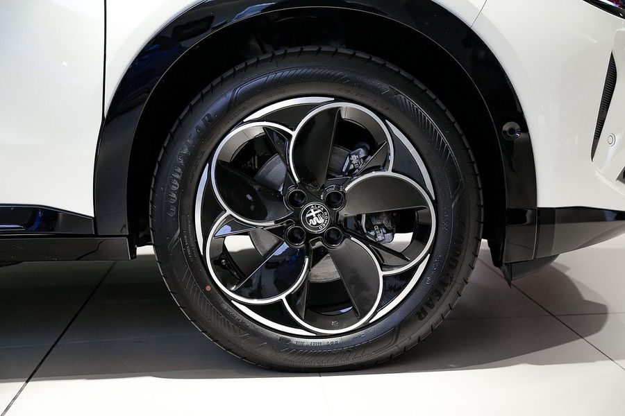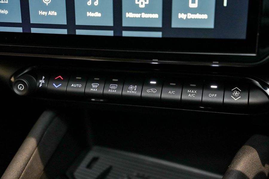 Its bold exterior features the iconic "Scudetto" V-Shield, sleek black LED taillights, and the aerodynamic Coda Tronca design inspired by Alfa's racing heritage.